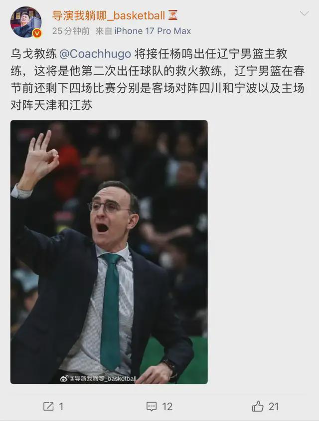 据报道,外教乌戈-洛佩兹将接替杨鸣,成为辽宁男篮新任主教练。这是乌戈第二次出山救火,此前杨鸣因为家庭问题短暂离职,乌戈担任了一段时间的主教练,效果非常好,年轻球员也得到了上场时间。